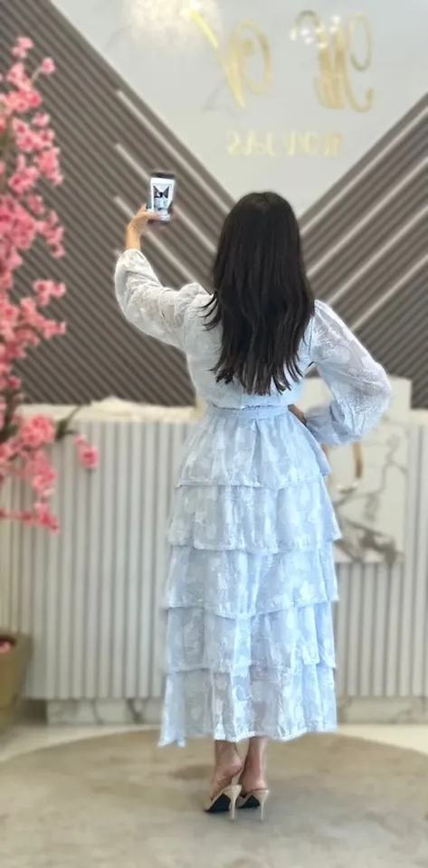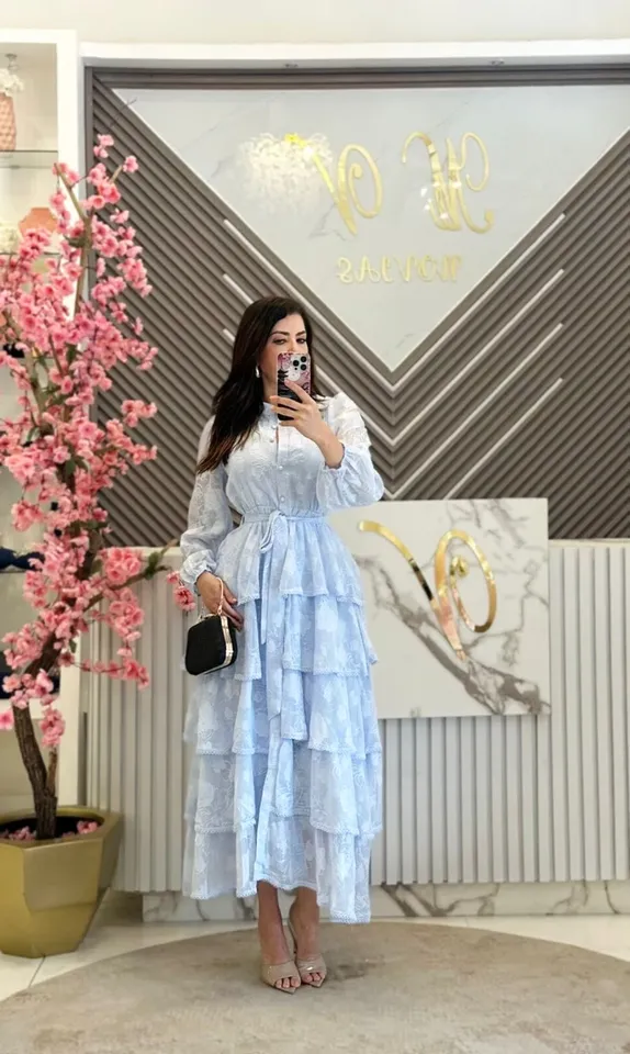 / VESTIDO AZUL CON OLANES Y MANGAS